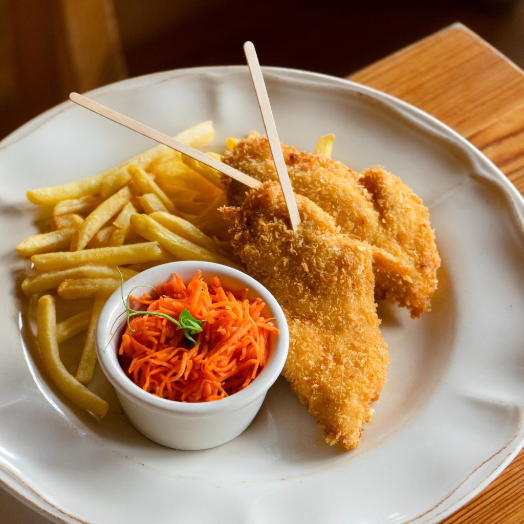 Filet z kurczaka zrolowany z frytkami stekowymi i zestawem surówek