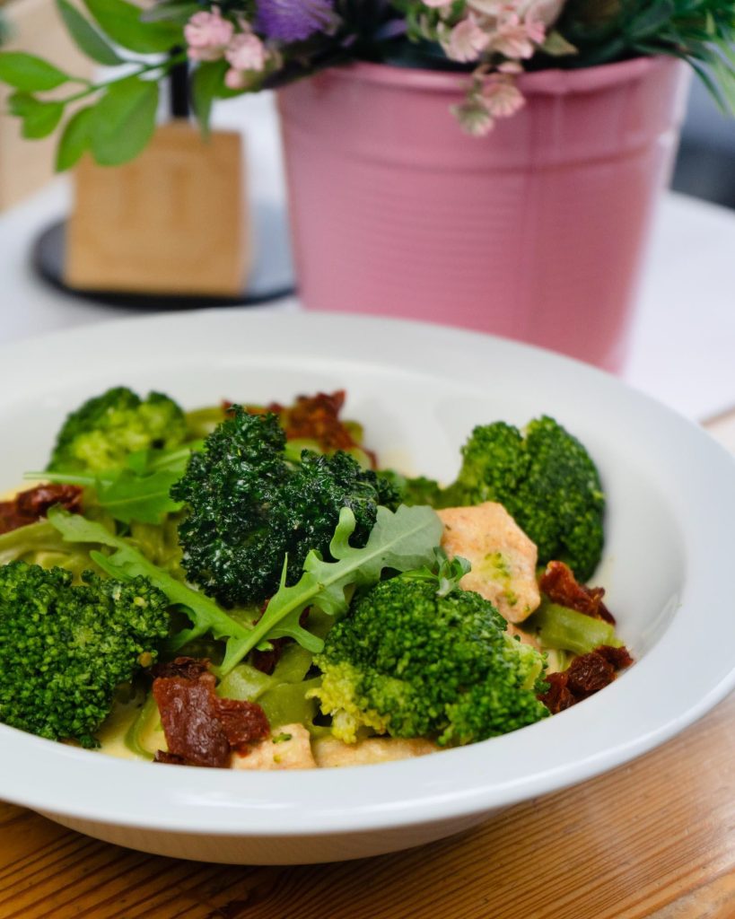 Zielone Tagiatelle z kurczakiem brokułem, pomidorami i sosem serowym