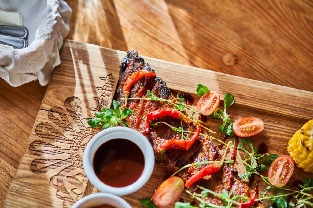 Karczek z grilla z opiekanymi ziemniakami, zestawem surówek i sosem czosnkowym