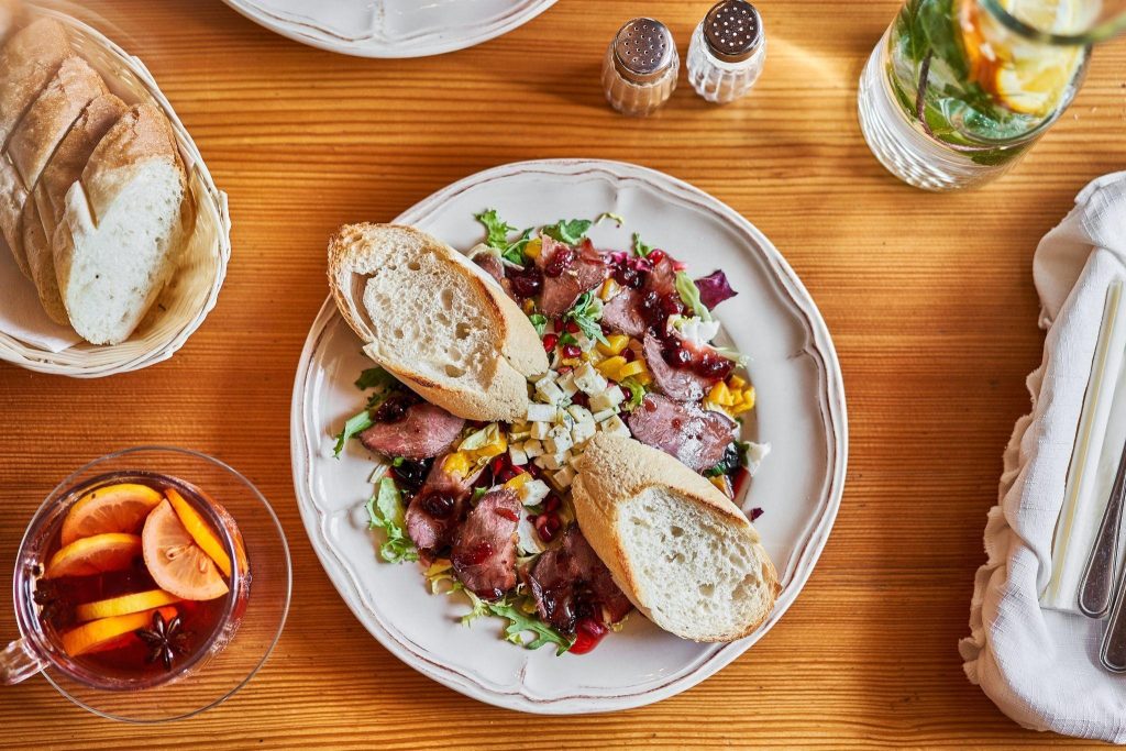 Pierś z gęsi, granat, broskwinie, ser lazur, mix sałat, sos żurawinowo – winny