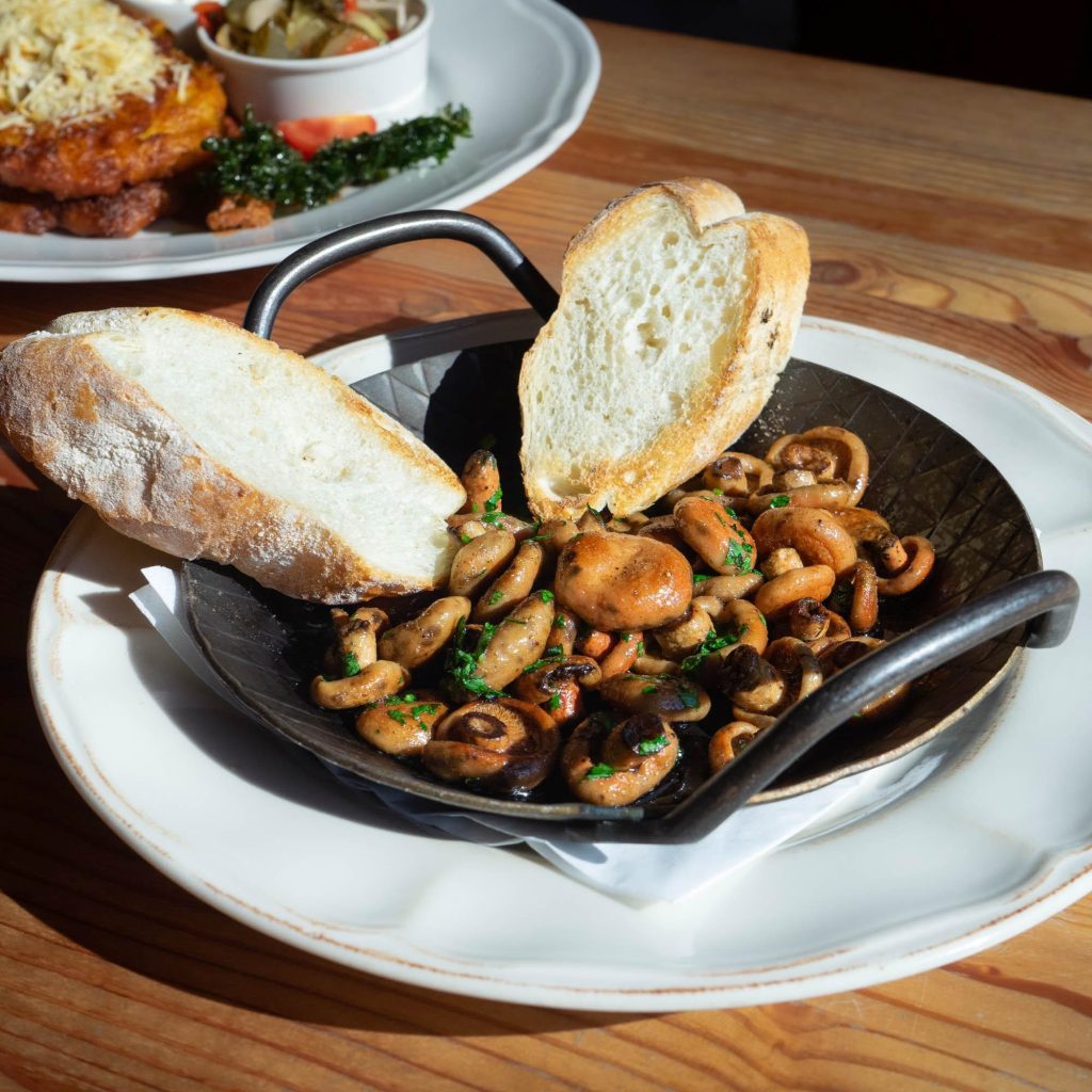Stek polędwicy wołowej z borowikami, puree ziemniaczanym i zestawem surówek